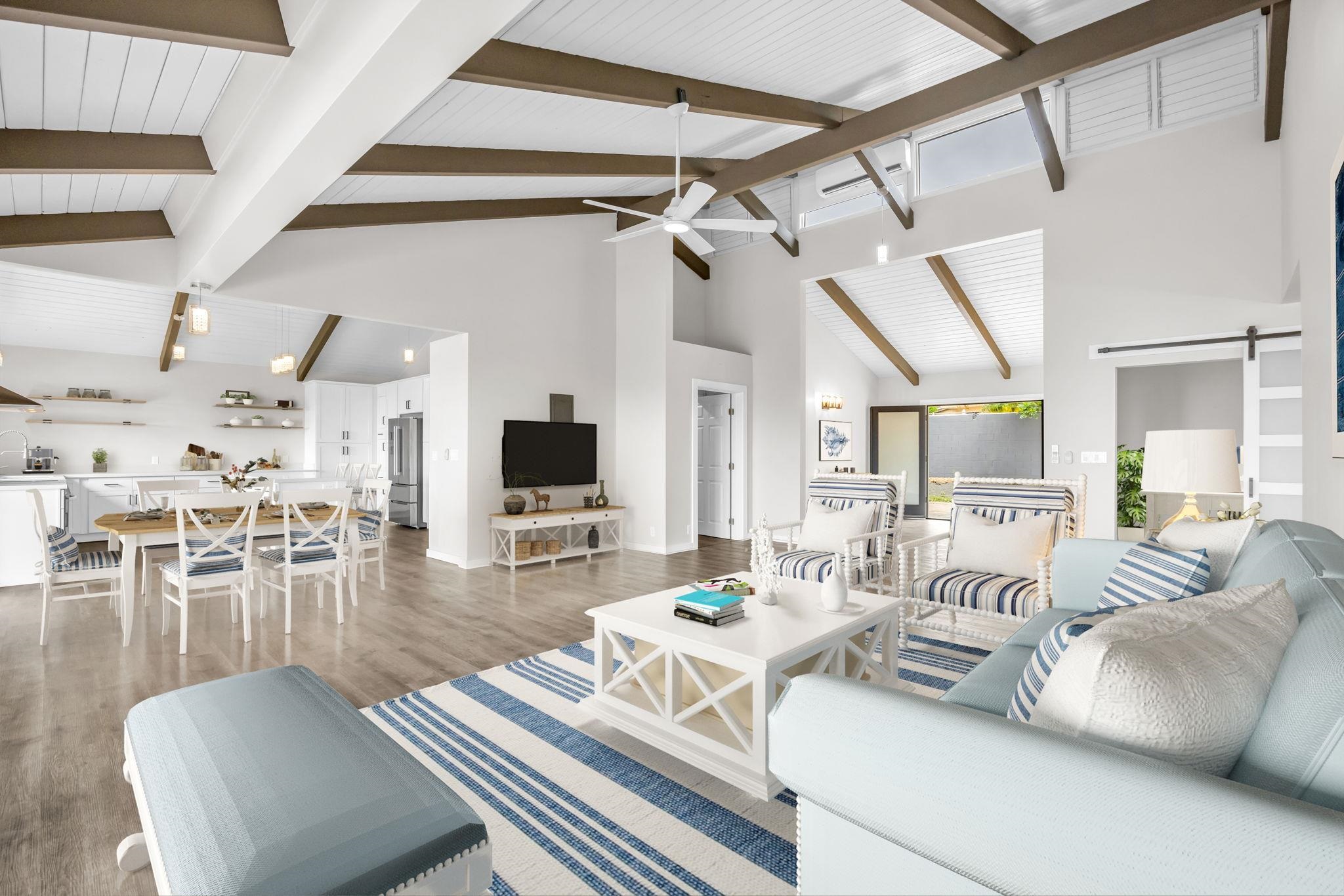 Up to 3 units total. 3 Bed 2 Bath Main Dwelling + Attached Studio Ohana + 1 Bed 1 Bath Unattached Cottage Ohana with lanais on both buildings. Maui Meadows is renowned for its awe-inspiring ocean views. Prominently situated with a single level on the hillside, you'll discover within this contemporary elegant home, a spacious living-room kitchen area that seamlessly extends to the highlight of the property, an expansive covered lanai with breathtaking views of the ocean and outer islands. Watch the boats race to Molokini in the morning, or view the whales breach while grilling dinner with family and friends. This remarkable half acre property just underwent a complete transformation. Beautifully reimagined and thoughtfully finished, the Main Dwelling provides a large chef’s kitchen with high open beam ceilings, new floors, Quartz countertops, and stainless steel farmhouse sink, perfect for gatherings. From the living-room hallway, you will pass 2 Bedrooms and 1 Bath on your way to the Primary Suite, with large en-suite bath, which provides a perfect space for modern luxury living, complete with a 4 zone mini split AC system for your comfort. For added convenience, this contemporary residence is divided into three distinct living spaces. The Attached Studio Ohana is connected to the main dwelling through a solar service and storage closet, which can be used flexibly as a fourth bedroom with en-suite bath, or as a convenient grandmother's quarter's for rental income. Additionally, the Detached 1-bedroom, 1-bathroom Cottage Ohana with a covered lanai can provide steady rental income to help with island expenses or serve as extra living area for family with ample locked indoor storage underneath. Experience the luxury of island living in this contemporary versatile residence, nestled high in one of South Maui’s most desirable neighborhoods. All this just minutes from the beach, Wailea’s world-class restaurants, golf courses, and everything that South Maui has to provide. Contact your favorite Realtor today to schedule a showing! Digital staging used in some of MLS photos.